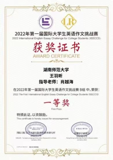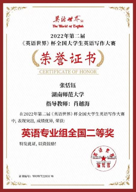 王羽昕、谭佳、毛佳妮分别在由国际(澳门)学术研究院外语教育研究所、香港语言研究会主办的第一届国际大学生英语作文挑战赛中荣获一、二、三等奖;张恬钰在由商务印书馆《英语世界》杂志社主办的第二届《英语世界》杯全国大学生英语写作大赛中荣获二等奖;邱立强在由2022年“联合国采购杯”全国大学生英语能力大赛组委会主办的“联合国采购杯”全国大学生英语词汇大赛中荣获三等奖;王羽昕在由中国文化信息协会创新文化传播专业委员会主办的第四届全国高校创新英语词汇赛中荣获优秀奖;张恬钰、贺静怡与学业导师肖越海教授在《南华早报》(South China Morning Post, SCMP)联合发表4篇时事评论文章。