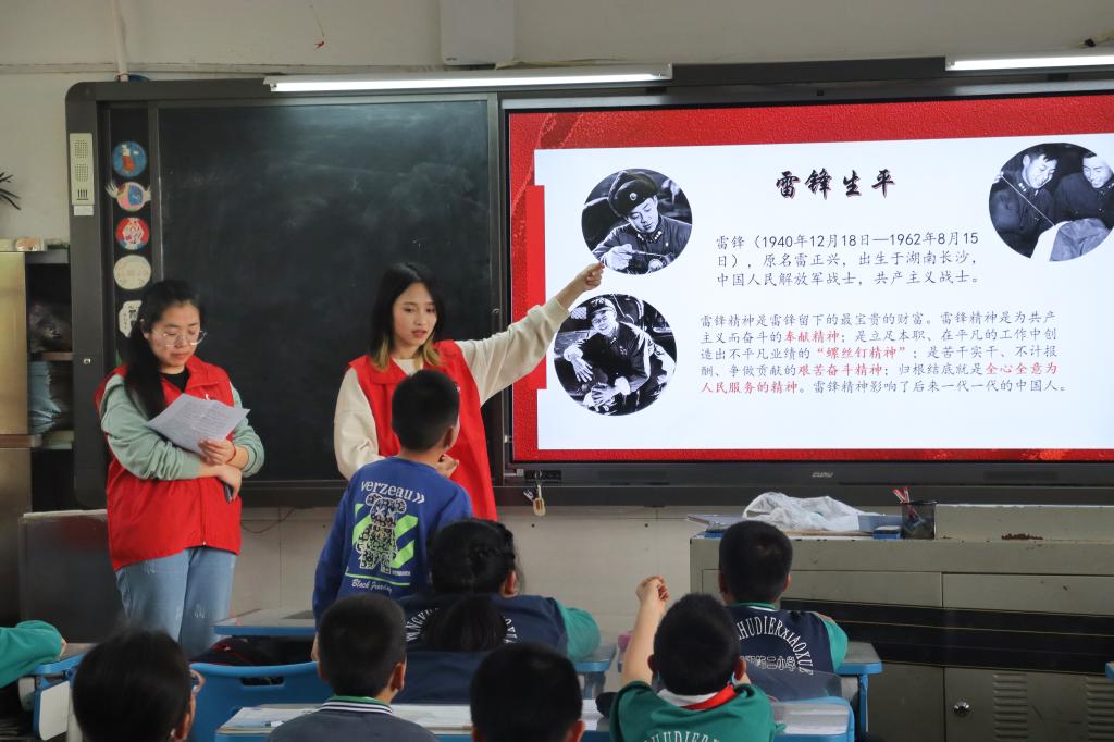 主讲人施绮幸、江森运用问答和视频等方式,为望月湖第二小学四年级一班的小朋友们讲述雷锋的感人事迹,引导小朋友深刻认识雷锋精神的永恒价值和时代内涵。志愿者们帮助小朋友完成了雷锋叔叔的形象绘画,课堂氛围热烈,活动取得圆满成功。