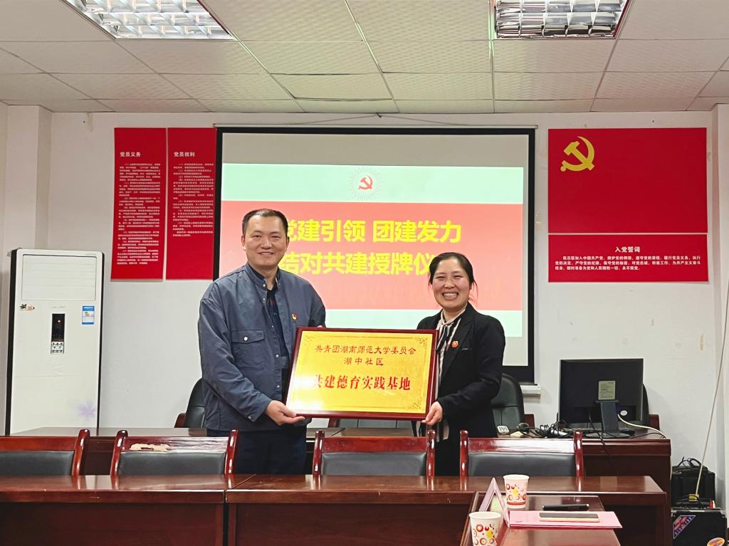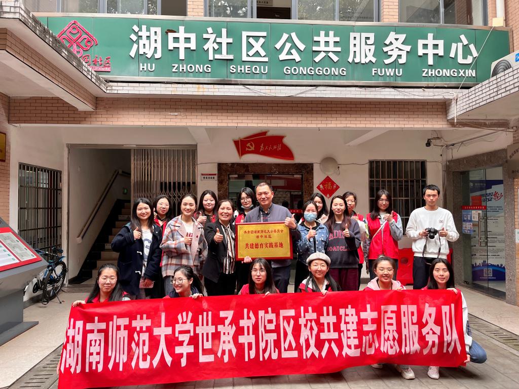 罗艳、李佳分别代表区校双方签署yl23455永利官网与长沙市岳麓区湖中社区区校共建协议,挂牌建立“公司与湖中社区共建德育实践基地”,全体参会人员于湖中社区公共服务中心前合影留念。