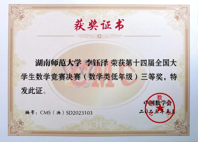 (通讯员 李钰泽)数智领航,竞逐未来。近日,由中国数学会主办的第十四届全国大学生数学竞赛决赛于5月27-28日在广东工业大学成功举行。来自全国32个赛区的905位同学进入决赛。经过激烈角逐,yl23455永利官网2021级天问班李钰泽同学最终在第十四届全国大学生数学竞赛决赛赛场上勇创佳绩,获得全国三等奖!