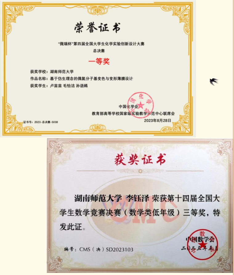 两年来,书院集聚学校雄厚师资和优势资源,积极构建拔尖创新人才选拔评价、过程管理、质量监控、联动协同等机制,实施优生优培计划,人才培养初显成效。2022年4月,学校以“世承拔尖创新人才培养模式”为核心成果的“地方院校‘四轮驱动+四融并举+三维同构’培养拔尖创新人才的探索与实践”项目,荣获第十三届湖南省高等教育教学成果奖一等奖。书院学生在学科竞赛、创新创业竞赛、社会实践等评选中获省级及以上荣誉70余项。其中2021级李钰泽获第十四届大学生数学竞赛全国三等奖;2022级李悦嘉获第五届大学生语言文字能力大赛全国一等奖;2021级卢苗苗获第四届大学生化学实验创新设计大赛全国一等奖;2021级易泽文等2人获第八届大学生生命科学竞赛全国二等奖;2021级易泽文获2022年大学生创新创业训练计划项目国家级立项;2021级施绮幸获评2022年湖南省“三下乡”社会实践省级优秀个人;2021级丁兰若获2023年湖南省大学生节能减排社会实践与科技竞赛一等奖,她撰写的“三下乡”社会实践调研报告《讲好乡村振兴经验,服务精准国际传播》被湖南省委外事工作委员会办公室采纳。