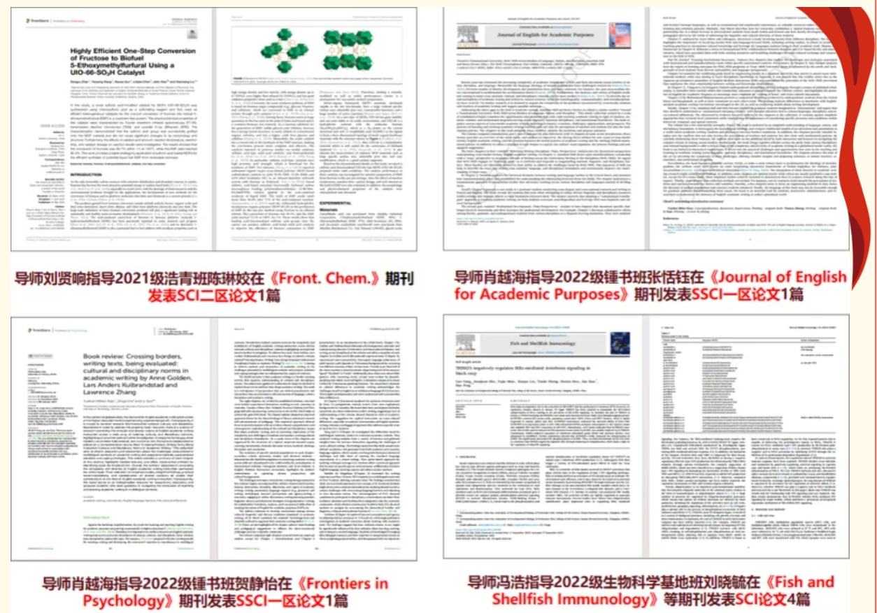一是注重大师引航,为每位学生配备学业导师。书院秉承“大师铸就大师”理念,努力构建师生学习发展共同体,打造高质量导师团队,汇聚热爱教育、造诣深厚、德才兼备的学术大师参与拔尖人才培养,通过学术大师的言传身教,加强对学生的精神感召、学术引领和人生指导。书院共公开选聘学业导师291名、班导师27名,要求其在教学、科研、思想、学习等各个方面对学生进行引领,帮助学生塑造正确的世界观、人生观、价值观。其中导师肖越海指导2022级锺书班张恬钰在Journal of English for Academic Purposes发表SSCI一区论文1篇,指导2022级锺书班贺静怡在Frontiers in Psychology 发表SSCI一区论文1篇,指导2022级锺书班邱立强等学生在《南华早报》发表英文时事评论8篇;导师冯浩指导2022级生物科学基地班刘晓毓参与发表SCI论文4篇,指导学生团队获得全国大学生生命科学竞赛国家级二等奖;导师翟亚新指导2021级周光召班刘中洲获大学生物理学术竞赛全国二等奖、大学生物理实验竞赛(教学)全国三等奖;导师刘贤响指导2021级浩青班陈琳姣获湖南省第十四届大学生课外化学化工创新作品竞赛特等奖和湖南省第十二届大学生化学化工学科竞赛一等奖,并在Front. Chem.发表SCI二区论文1篇。