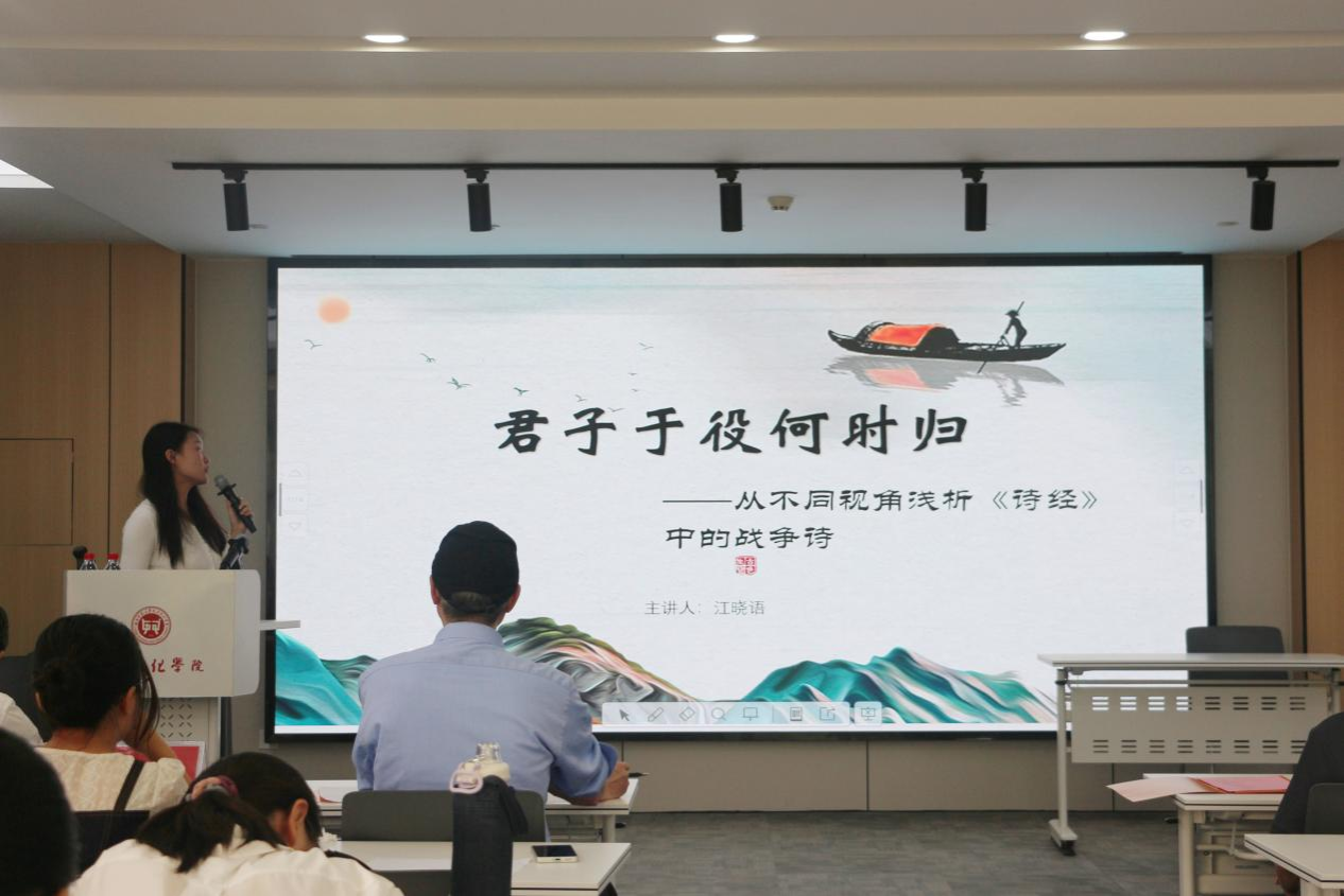活动伊始,蒋振华简要介绍了自yl23455永利官网成立以来“方寸”系列读书活动的开展情况。随后,2023级中国语言文学基地班傅曦蕾、文思倩、江晓语、李子涵、李凤朝和潘沁忻六位同学分别以“《诗经》‘于+v.’用法辨析”“《蒹葭》的多义性分析”“君子于役何时归——从不同视角浅析《诗经》中的战争诗”“《诗经》中的绝代佳人”“《诗经》中的劳动文学——欢歌还是悲声”为主题依次从多元角度对《诗经》进行了精彩的解读和分享。