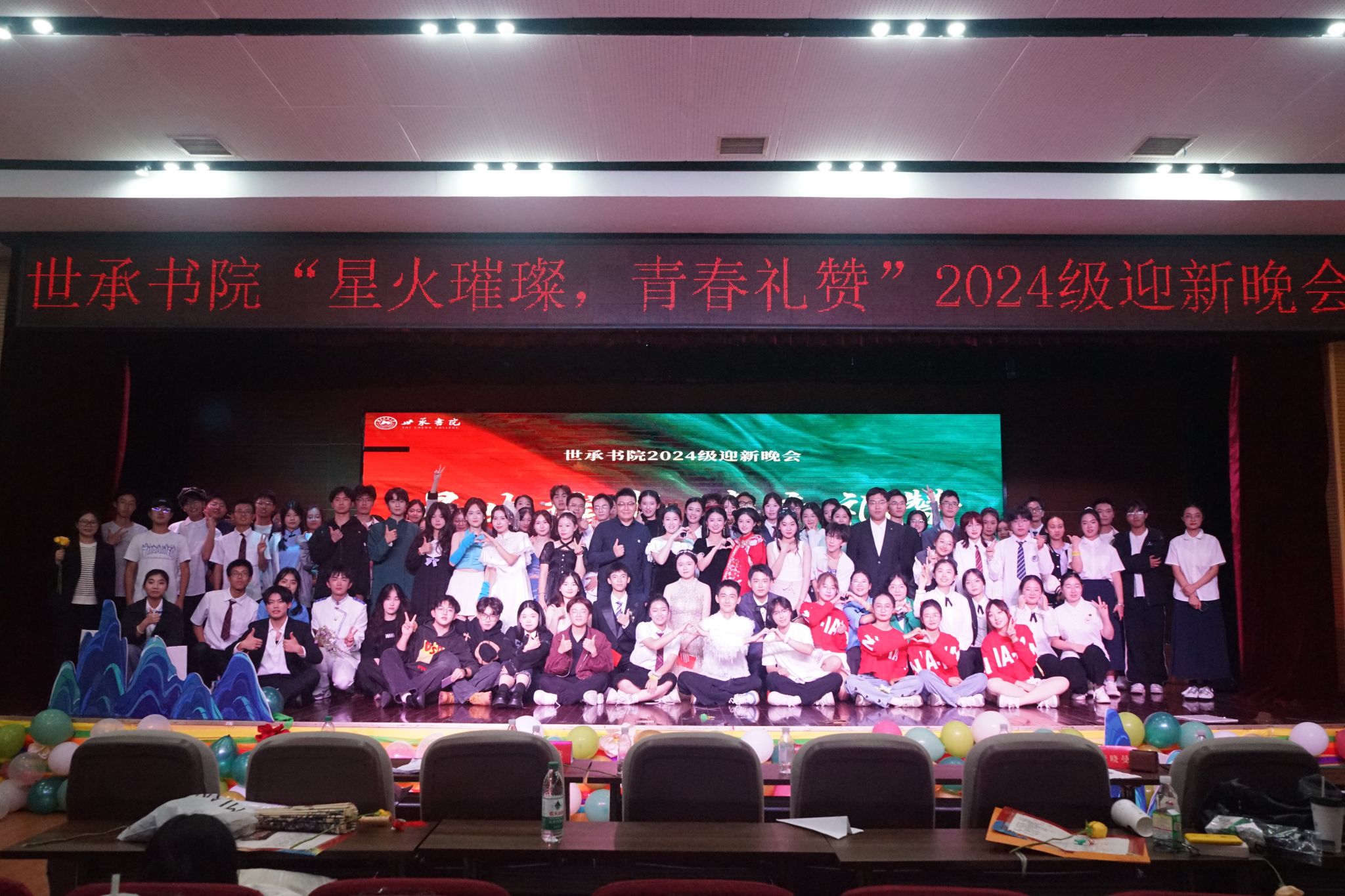 《trendsetter》街舞表演将晚会推向高潮,表演者精湛的舞技和独特的风格,展现了青年一代的活力与创造力;《R&B All Night》的婉转歌声娓娓道来,如清泉般流淌在每个人心中;朗诵《夏花已秋,春心未冬》通过富有诗意的语言,表达了对生命美好与永恒的向往。最后,彭诚意、唐晓曼与学生深情合唱《错位时空》,悦耳的歌声与小提琴旋律完美交织在一起,精彩纷呈的迎新晚会在与会嘉宾和全体工作人员的合影中圆满落幕。