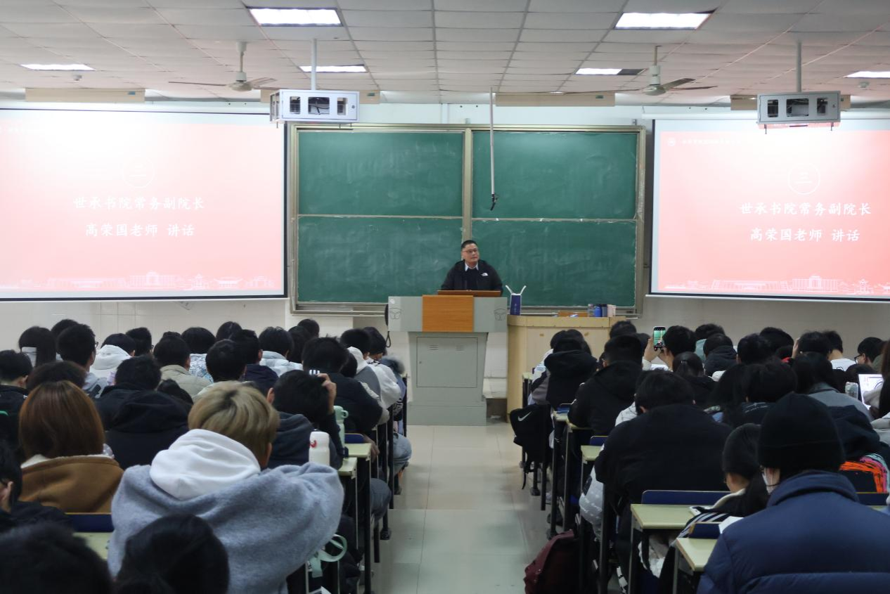 最后,高荣国进行总结讲话。他深刻阐释了书院的办学理念与宗旨、人才培养目标,并鼓励同学们要准确自我定位,珍惜善用双院资源,锤炼坚韧不拔品格,积极提升并完善自我。他强调,作为世承青年更应锚定强国建设和民族复兴的伟大目标,为成为拔尖创新人才而不懈努力奋斗,肩负起时代赋予我们的责任和使命。