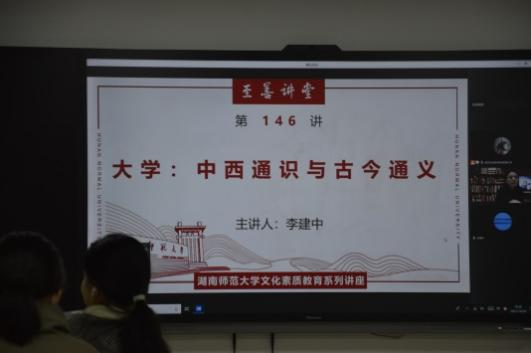 李建中以《大学》为切入点,首先向同学们介绍了大学三义,第一义就是大学之经典义,在讲解过程中李建中分别提到了三纲领和八条目,介绍了至善讲堂名字的由来——“大学之道,在明明德,在亲民,在止于至善。”并且告诉同学们上大学就是格物的过程,而格物是为了正心,正心最终是为了修身;第二义是大学之学校义,第三义是大学之方法义。然后李建中向同学们介绍了以“天下方术、圣者通也、教人之法”为核心内容的大学三通,紧接着又向同学们介绍了大学的近代之通:元典精神、博雅精神、会通精神。李建中教授告诫同学们学习不能仅仅局限于自己的专业,还要实现“成人”与“成才”的会通。在讲解完大人之学、大用之学、大道之学后,李建中指出大一是立人之良辰、经典是育人之根本、良师是树人之楷模,指出大学生们应该走出“内卷”,从做题到做人。就如何做人,李建中先向同学们介绍了“徒”——从工具理性到价值理性,然后介绍了“四通六识”——“四通”是指一通中外、二通古今、三通文理、四通知行;“六识”是指渊博的学识、卓越的见识、经典阅读意识、文化批判意识、独立思考意识、团队合作意识。最后在结语中李建中再次指出:大学生要破解“内卷化”困境,实现“大人之学”;要摒弃“工具主义”,实现“大用之学”;要超越“标答思维”,实现“大道之学”,并指明大学教育在于“通天下之不通”。