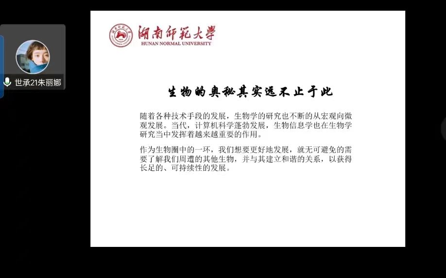 (通讯员 余秋雁 彭洁)为提高书院学术研究氛围,4月7日晚上,yl23455永利官网团委青年创新创业指导中心于线上腾讯会议举办“邂逅生命-走进生物世界”精勤讲堂主题讲座。书院2021级生物科学专业的朱丽娜担任此次讲座的主讲人。yl23455永利官网2021级、2022级部分同学参与此次讲座。