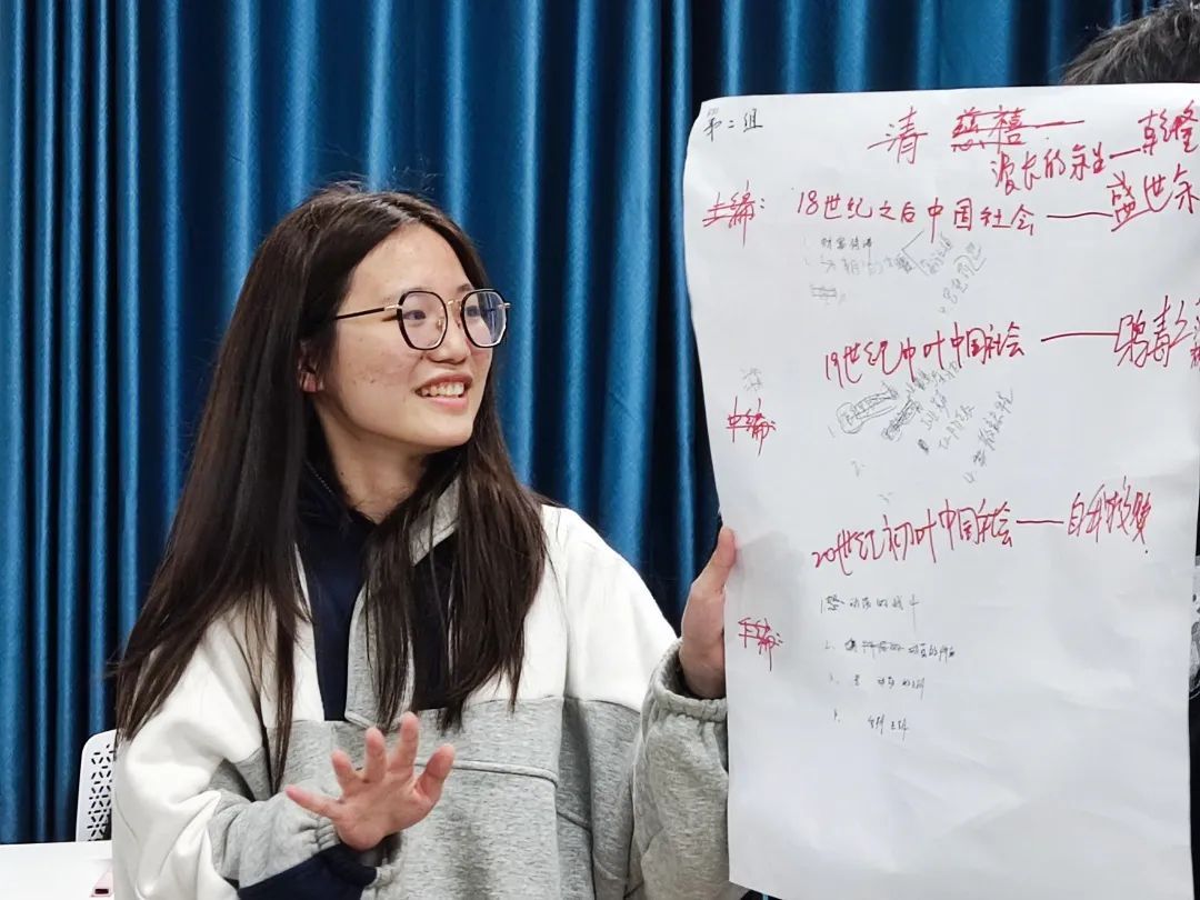 在第二个环节“我笔下的清史”中,每个小组用十五分钟来设计自己的清朝史目录,并派代表进行展示、分享。同学们讨论热烈、设计巧妙,共同完成了《爱兴觉罗兴亡史》《漫长的余生——乾隆之后的清朝时代》《清史》《少数民族政权的清流》四份极简清史目录,现场气氛活跃。