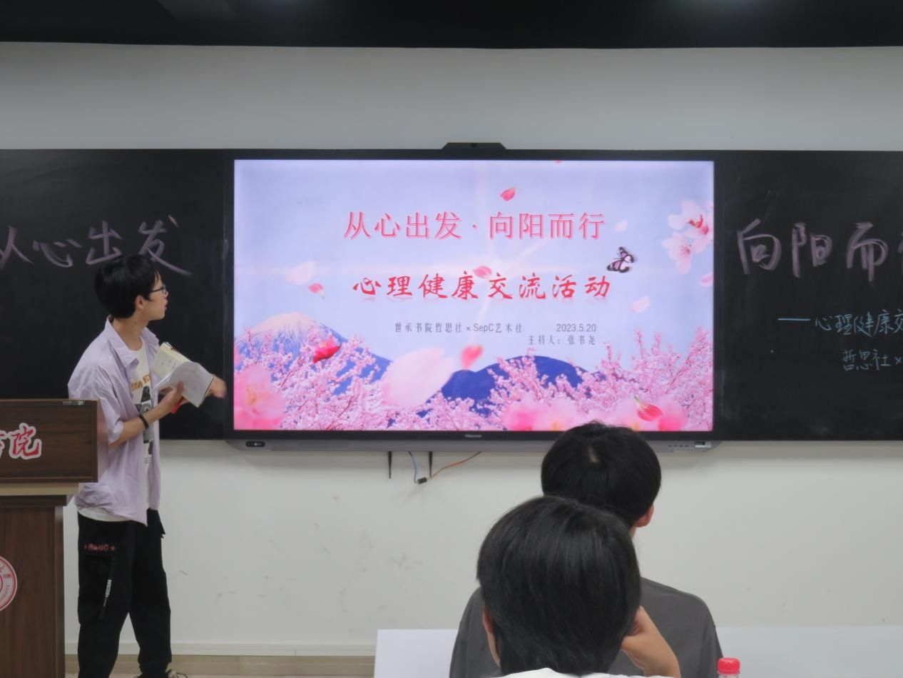 (通讯员 戴颖玉)为营造出校园积极、健康、和谐的心理健康教育氛围,引导大学生树立正确的心理健康观念,5月20日19点,yl23455永利官网哲思社、SepC艺术社于129研讨室开展以“从‘心’出发,向阳而行——心理健康交流活动”为主题的第二次社团团日活动。活动由2021级哲学基地班张书尧同学主持,书院两大社团成员积极参与。