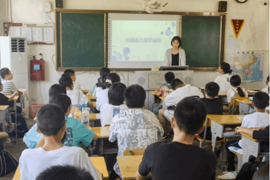 在我国古代数学成就课上,王嘉盈老师从中国古诗词入手,首先向学生们介绍了古诗词里的数学,吸引学生的兴趣,然后向学生们介绍了算数十经中《周髀算经》《九章算术》的一些基本内容及经典问题,最后介绍了我国古代其他的一些数学成就,比如:《九九乘法歌诀》、圆周率等。通过本次课程,老师成功地在学生脑海里留下了对我国古代辉煌的数学成就的基本印象。