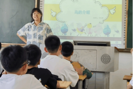 鸟类的科普课上,刘玉倩老师介绍了生活中鸟的存在、诗词中的鸟、鸟的结构特点、世界鸟之最,并以仿生技术为例介绍了鸟的贡献,课程丰富详实并配以准确生动的有关图片。课程的最后刘玉倩老师向学生们介绍了鸟类不容乐观的生存现状,呼吁大家保护鸟类多样性、让鸟儿的身影不会消失在蓝天白云中。