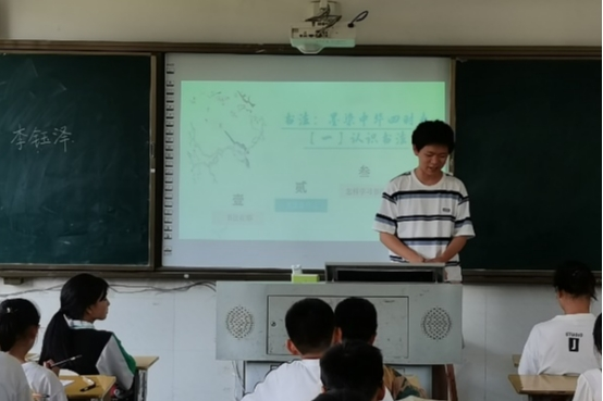 在书法课上,李钰泽老师系统的讲解了书法在哪、书法是什么、怎样学习书法。老师以“颜精柳骨”为引,具体向同学们解释了各家书法特点,让同学们对各书法家有了初步认识。课堂最后,老师向每一位同学分发练习纸,让同学们认真写下自己的名字,并将优秀作品收集展示。