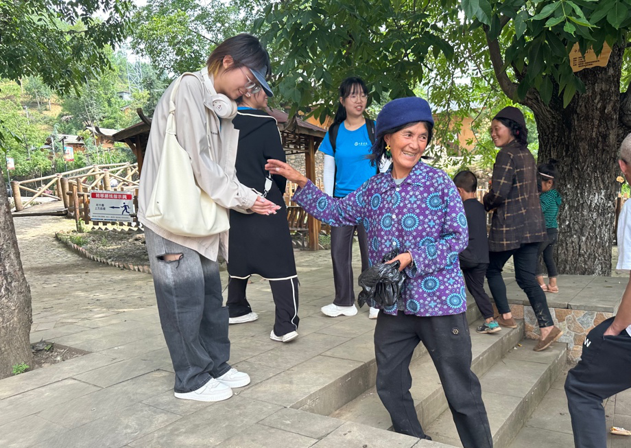 队员们到来这天,恰逢谷莫村庆祝一年一度的“库史”——彝族年。虽语言不通,但队员们受到村民们欢快的笑声和热闹的碰杯感染,也纷纷加入庆祝的人群。队员们拿出包里带的零食与彝族小朋友们分享,抱着小朋友在手中轻轻摇晃,很快与村民们打成一片。临走之时,一位彝家阿妈追着队员们来到村口,慌忙将塑料口袋中的一粒粒糖果发到每个同学手上,以此表现她对大家到来的开心和欢迎。