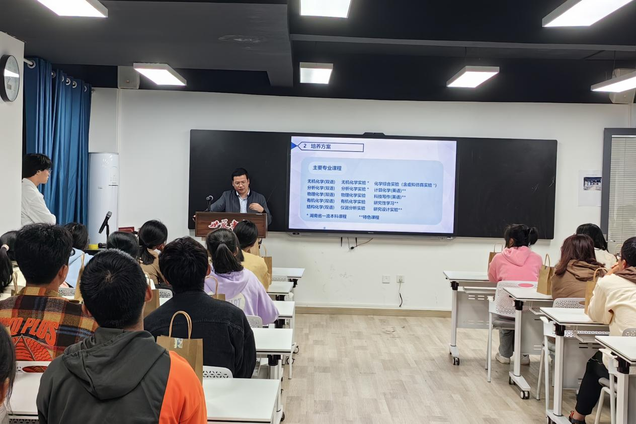 周明波分享了自己的求学和工作经历,重点介绍了浩青班的开班情况、化学专业的学习课程、历届浩青班学生的发展情况等,引导同学们对未来有更清晰的认知,鼓励同学们尽早做好个人规划,明确发展目标并为之努力奋斗。