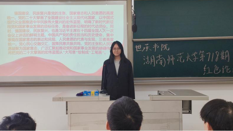 四位主讲人分别从“思想旗帜”“坚强核心”“强国复兴”“挺膺担当”四个主题进行分享。祝薏丹重点从“两个结合”、“六个必须坚持”、“十个明确”、“十四个坚持”、“十三个方面成就”等内容进行学习汇报。贺沁阳结合自己在团委组织部的学生工作经历,以“挺膺担当”为宣讲主旨,她从“青年力量”、“时代重望”、“干部‘挺膺’”、“青年‘担当’”等四个角度进行宣讲。丁兰若以“淬炼坚强核心,铸就青年精神”为主旨,带领同学们回顾新时代十年祖国的历史性成就和历史性变革,明晰青年使命,从而进一步号召同学们争做“有理想、敢担当、能吃苦、肯奋斗”的新时代青年。赵梓涵则围绕“强国复兴”主题展开宣讲,她指出青年一代要把个人成长与国家发展结合起来,自觉树立全球思维和世界眼光。