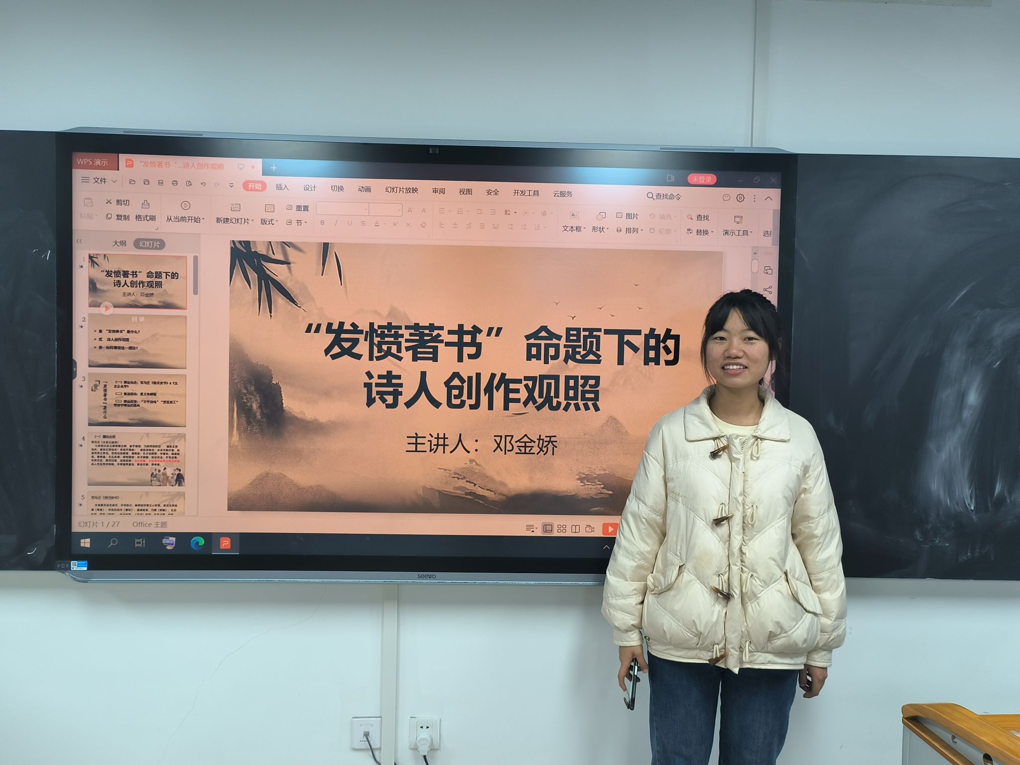 (通讯员 邓金娇 雷斯涵 陈俊龙)11月22日晚,yl23455永利官网“一间自己的屋子”文学主题读书分享会第三期活动于书院128研讨室顺利开展。此次活动由2022级中文基地班雷斯涵主持,2021级中文基地班邓金娇主讲“‘发愤著书’命题下的诗人创作观照”。