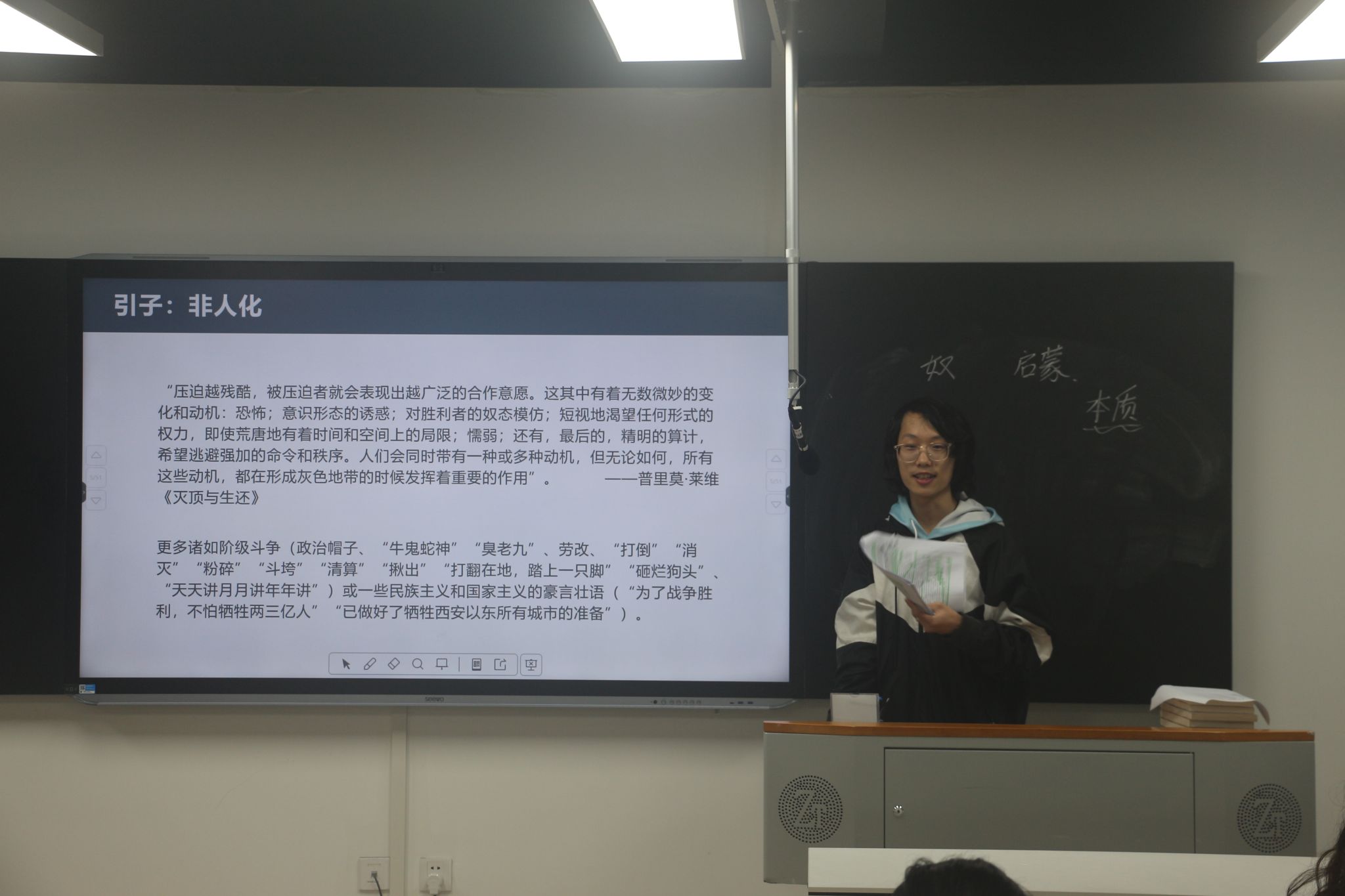 张书尧以利文斯顿的非人化为引,提出“究竟谁应当获得同我们认为的人类一般的平等地位?”的核心命题,并以此为出发点,通过动物权利论和动物福利论两种不同进路剖析了学界历来对待非人动物的态度与做法,并揭示了其各自蕴含的矛盾以及共同的“陷入人类中心主义的窠臼”问题。此外,张书尧还同在座的观众一起,伴随着更多理论的介绍与观众席的质疑和回应,共同畅想着物种意义上的人类与非人动物之间共生的可能样态。不管是努斯鲍姆的消磨物种的能力论,还是福柯对权力的一种历史考古学考察,都引导我们进入一种全新的视角去对待动物,乃至人类自身。