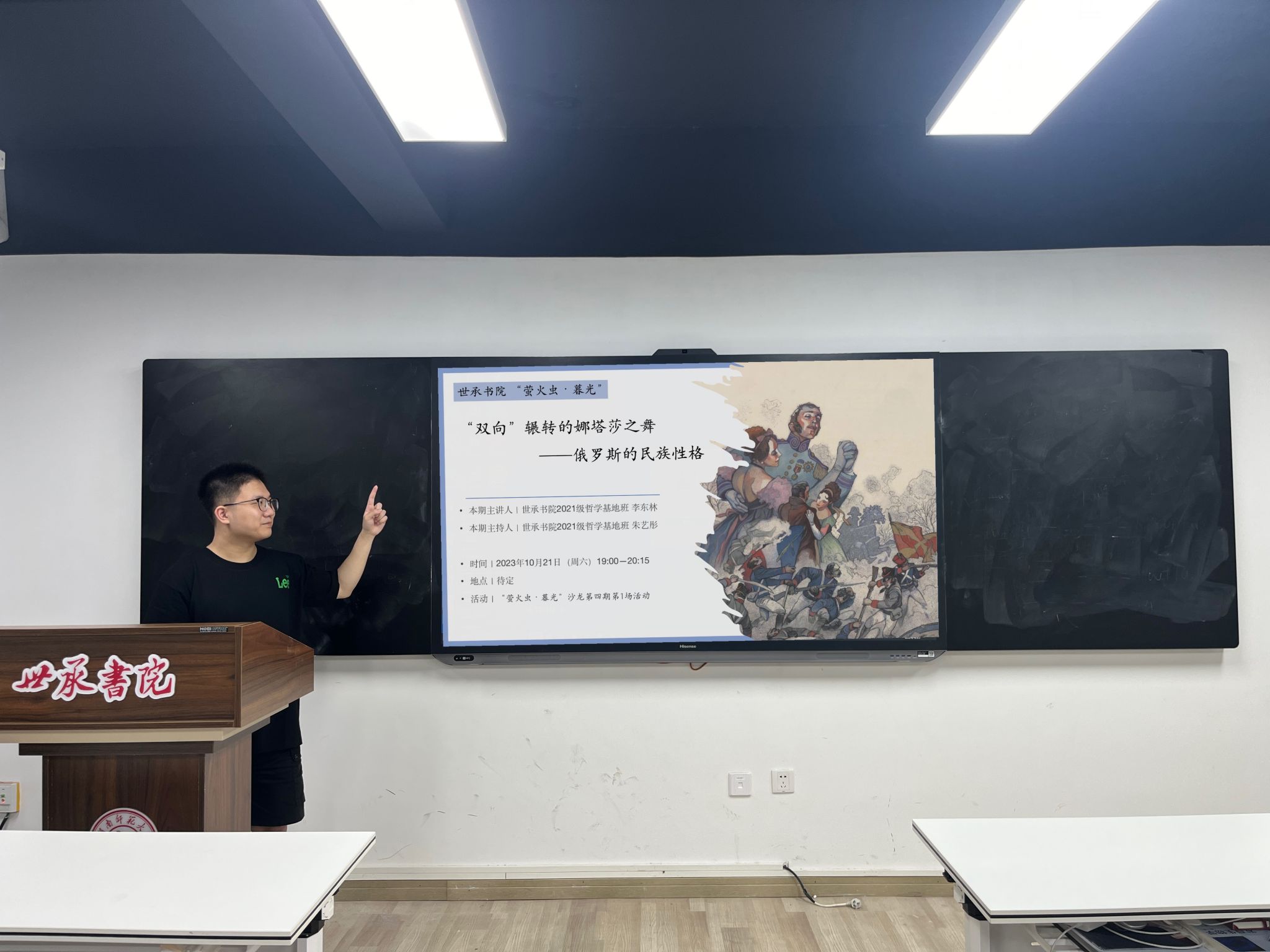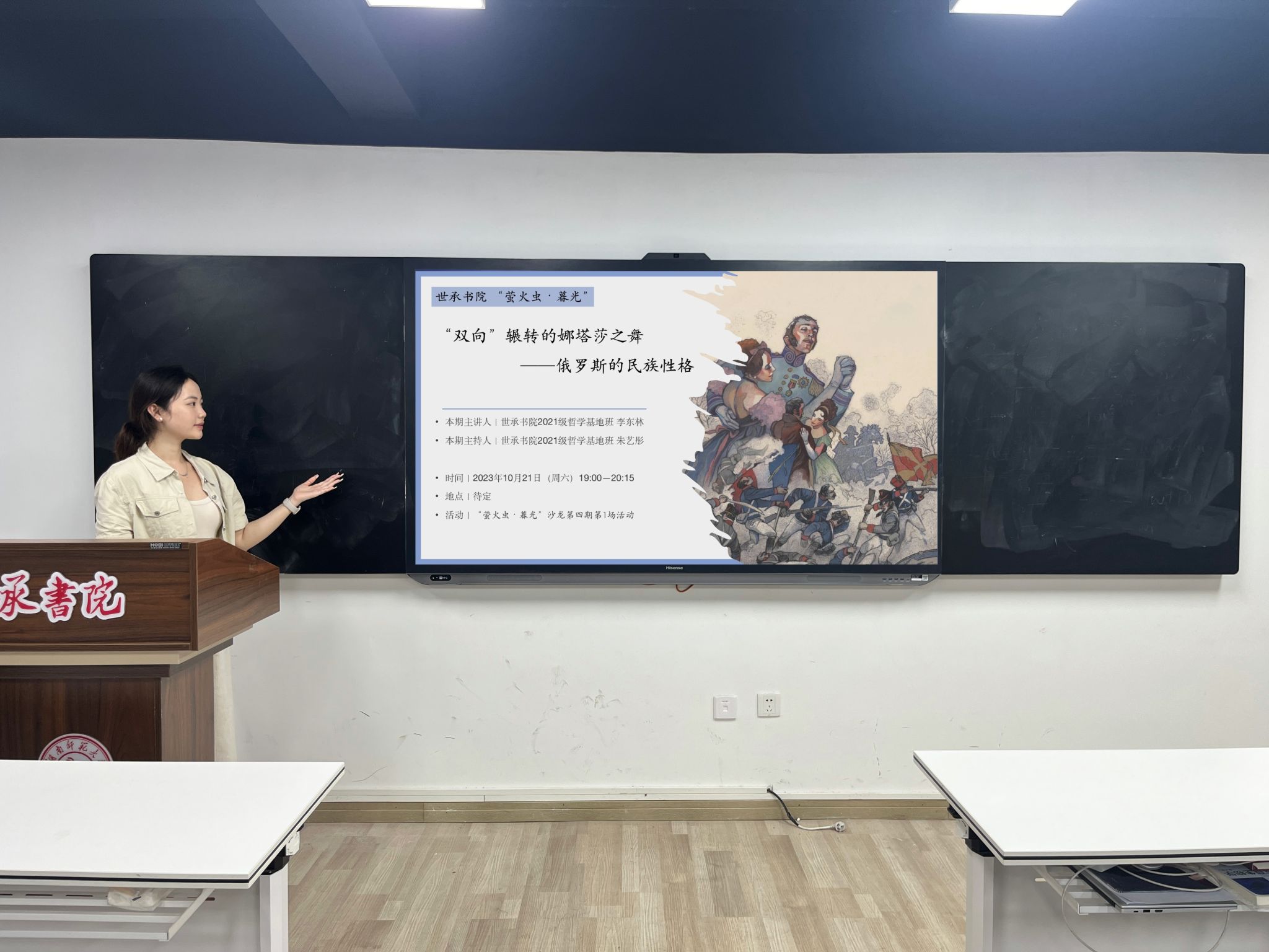 (通讯员 朱艺彤 李东林 吴泓锟)10月21日,yl23455永利官网举行了“萤火虫·沙龙”第四期第一场活动“双向辗转的娜塔莎之舞——俄罗斯的民族性格”。本次活动由2021级哲学基地班李东林担任主讲人,2021级哲学基地班朱艺彤担任主持人。