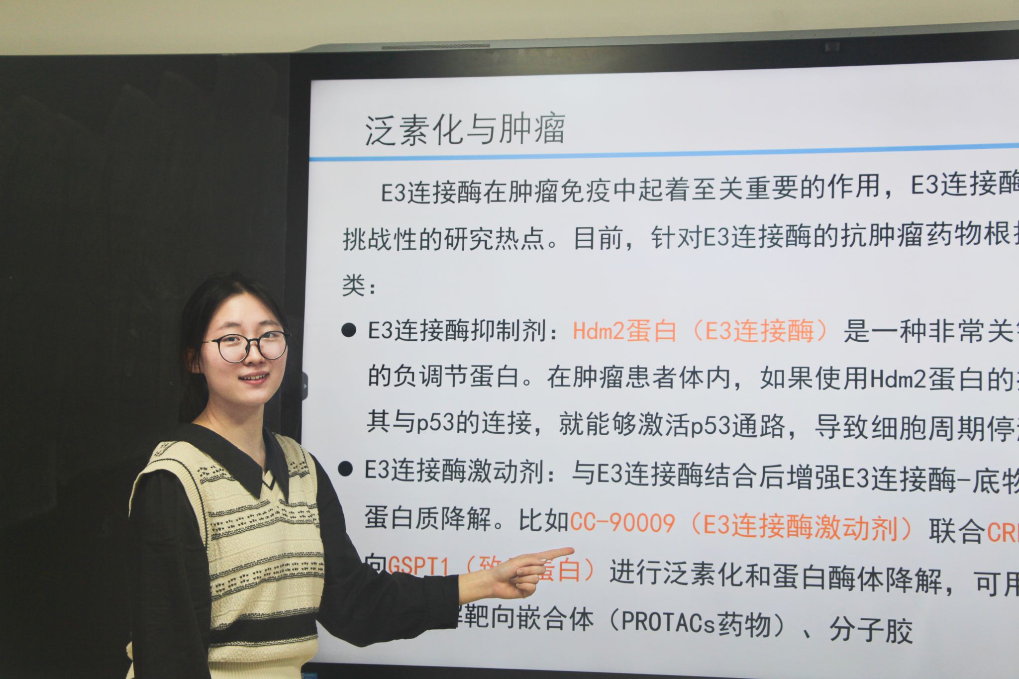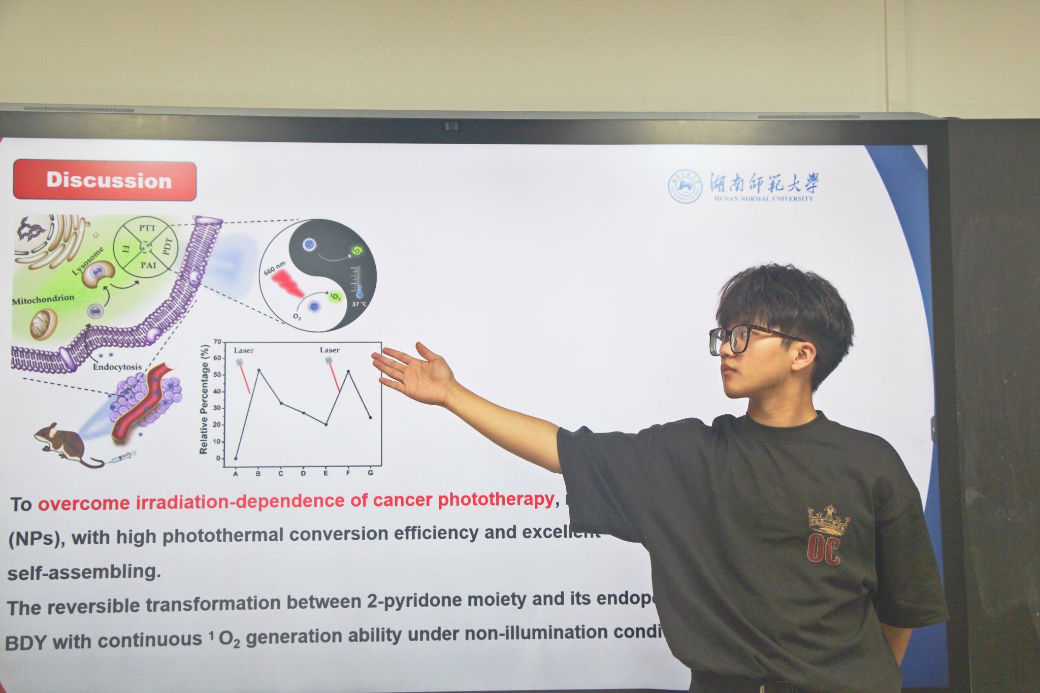 上半场,黄欣怡以“泛素化一探索肿瘤发生与治疗的新视角”为分享主题,为大家普及了癌症的基础知识,揭示了泛素化与肿瘤发生的相关机制,介绍了泛素化靶向治疗肿瘤的原理;下半场,吴巨擎以“光敏剂结构调控及肿瘤多模态光动力治疗”为分享主题,结合我国癌症现状、引用国际权威文献,向大家介绍光动力治疗这一新型疗法。分享过程中,同学们认真聆听,踊跃提问,与主讲人积极互动,营造出了浓厚的跨学科交流氛围。