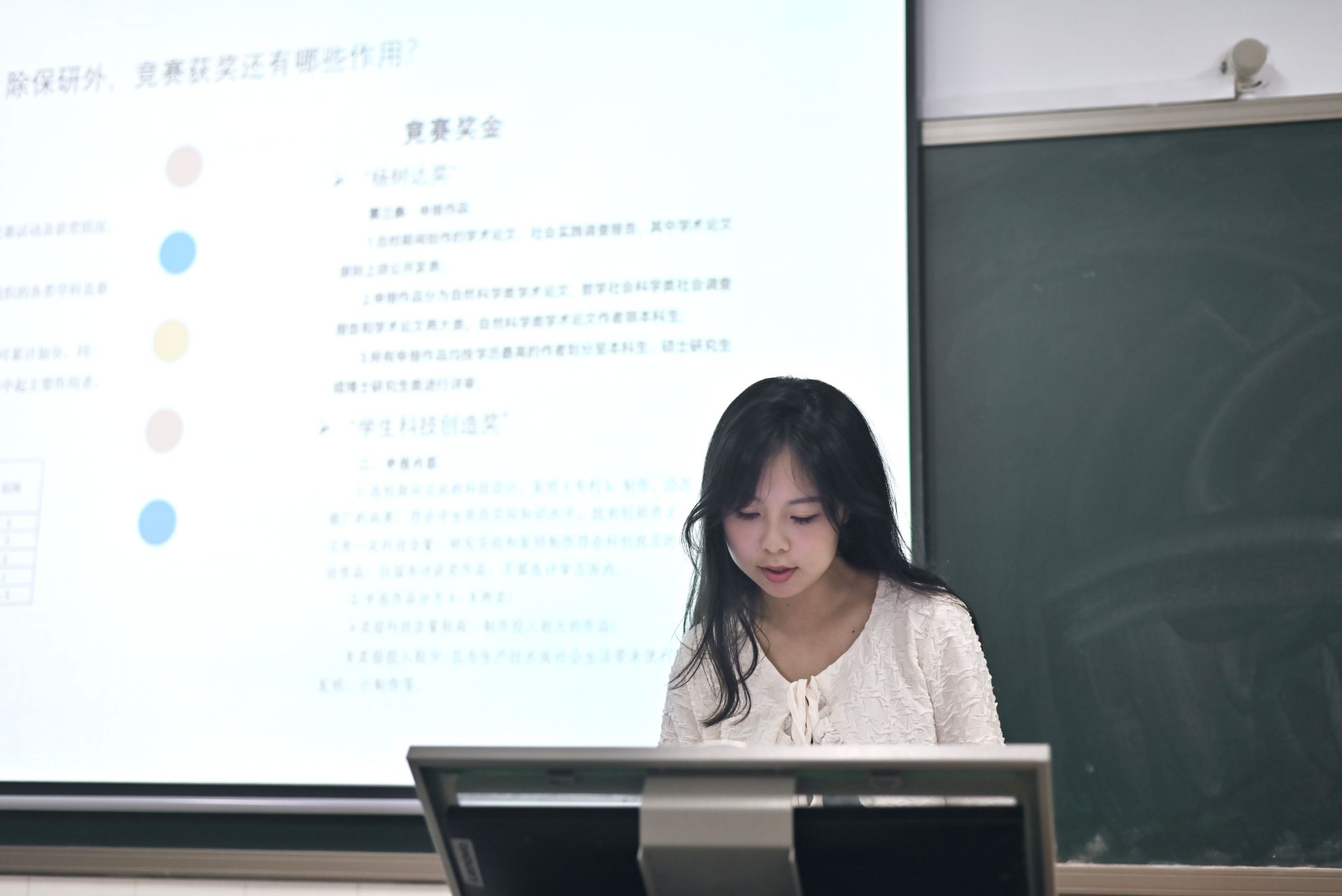 丁兰若分别从竞赛介绍、备赛流程、成果产出和奖项申请四个维度进行了经验分享。她表示,创新创业大赛能使同学们受益良多,不仅能锻炼同学们的思维模式,提高团队合作能力,还能提高同学们的竞争优势。她对备赛流程的时间节点、准备过程、样例展示(项目书和PPT)三个步骤进行了详细阐述。此外,她还分享了奖项申请的相关流程和渠道。