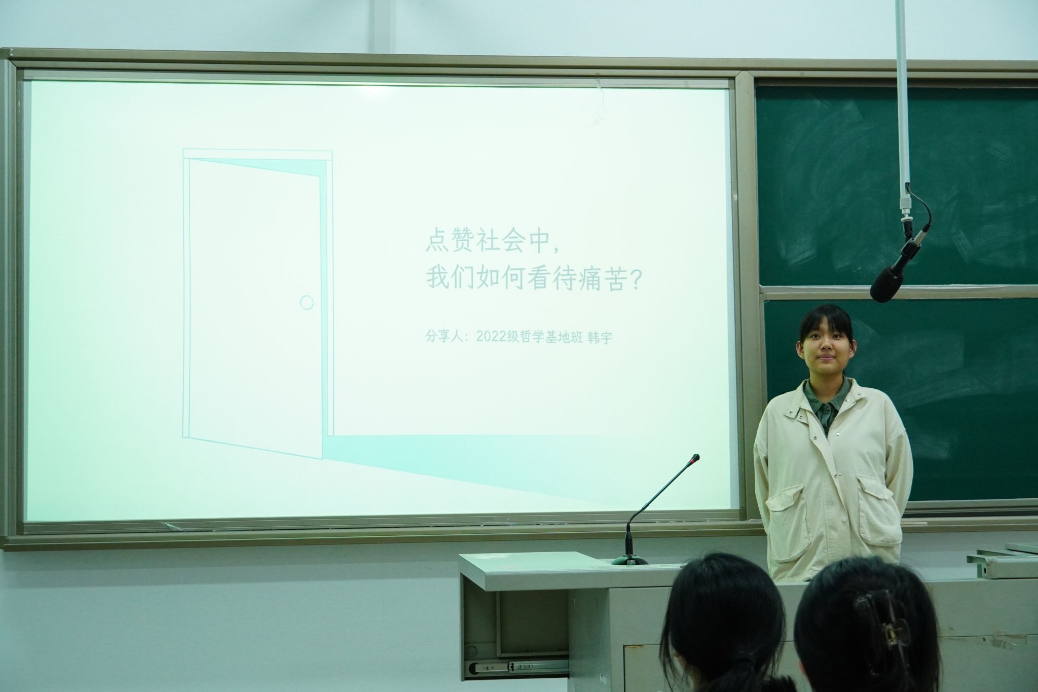 (通讯员 韩宇 雷斯涵 蒋霈琛)11月17日晚,yl23455永利官网“哲学和世界”主题读书分享会第五期活动于文学院407教室顺利开展。此次活动由2022级哲学基地班韩宇主讲“点赞社会中,我们如何看待痛苦?——基于对韩炳哲《妥协社会》的解读与反思”。