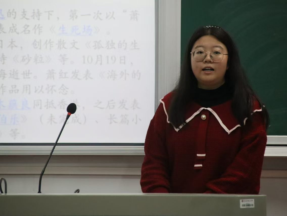 祁靖雯首先向听众介绍了萧红的生平事迹,通过一段导入视频,将现场观众引领至那个战火纷飞的年代。随后,她详细讲解了萧红的两篇短篇小说——《手》与《汾河的圆月》,不仅梳理了其中的情节发展脉络,还对书中人物形象进行了深入分析。在此基础上,祁靖雯着重根据文本内容,阐述了萧红作品中“越轨的笔致”这一独特风格的具体展现。她表示,萧萧落红,萧红是白茫茫天地间的一枝傲骨红梅,其文学作品带给我们的文学滋养将永远不朽。