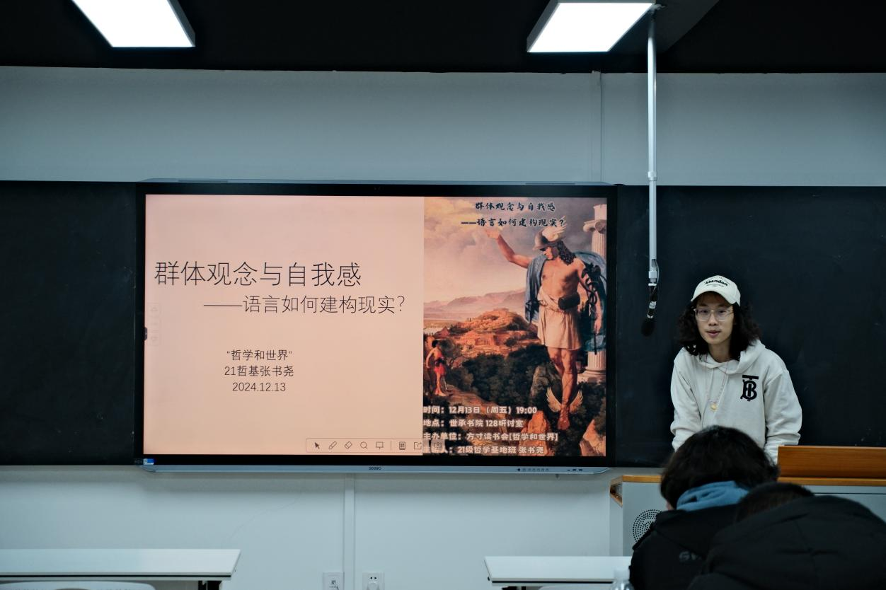 (通讯员 张书尧 方熙雅 雷斯涵)12月14日晚,yl23455永利官网“哲学和世界”主题读书分享会第八期活动于书院128研讨室顺利举行。此次活动由2021级哲学基地班张书尧主讲“群体观念与自我感——语言如何建构现实”。