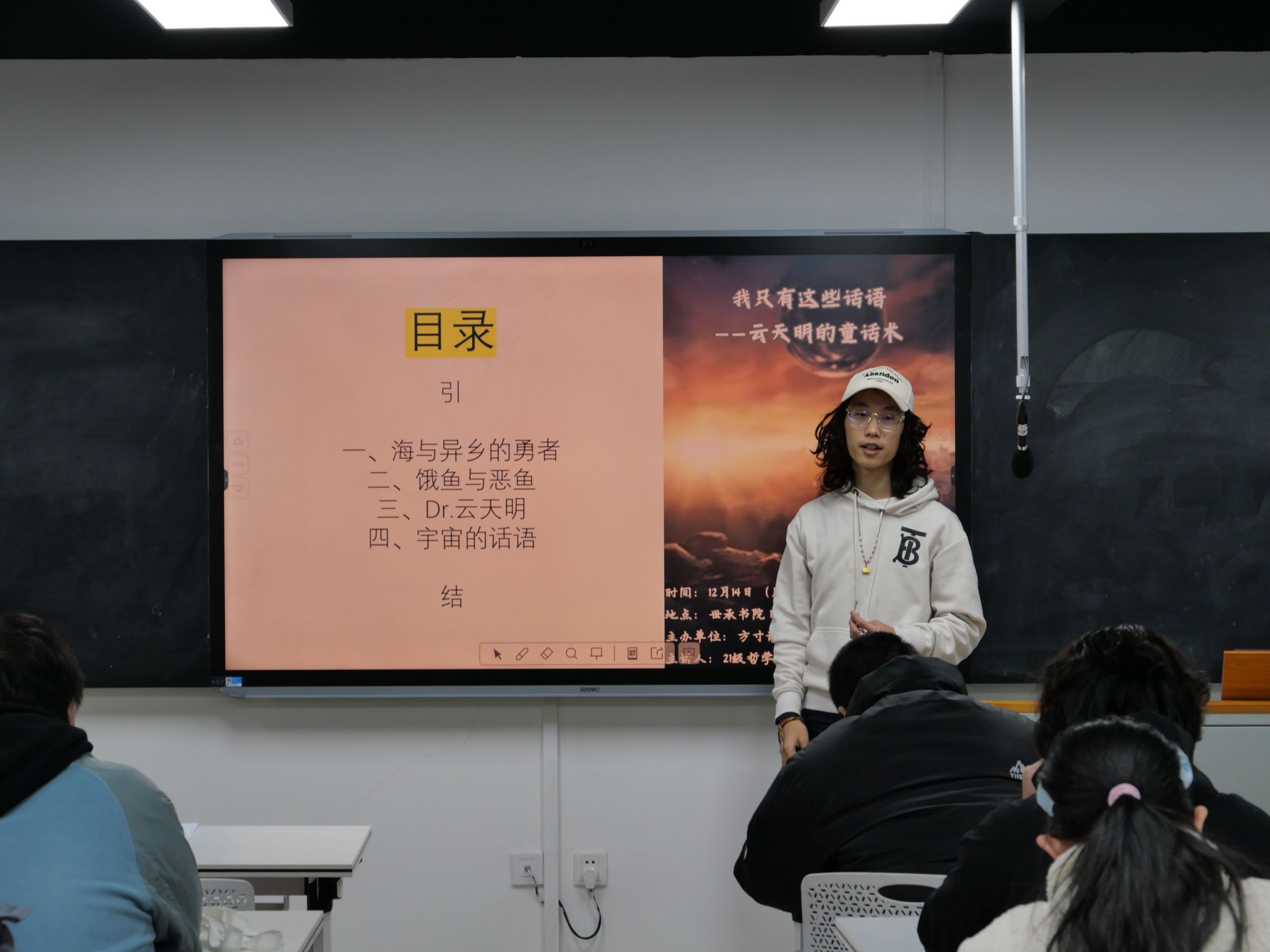 (通讯员 张书尧 邹晓文 潘秋屹)12月15日晚,yl23455永利官网“巡礼之年”短篇小说专题读书分享会第七期活动于书院128研讨室顺利举行。此次活动由2021级哲学基地班张书尧主讲“我只有这些话语——《三体:死神永生》中云天明的童话术”。