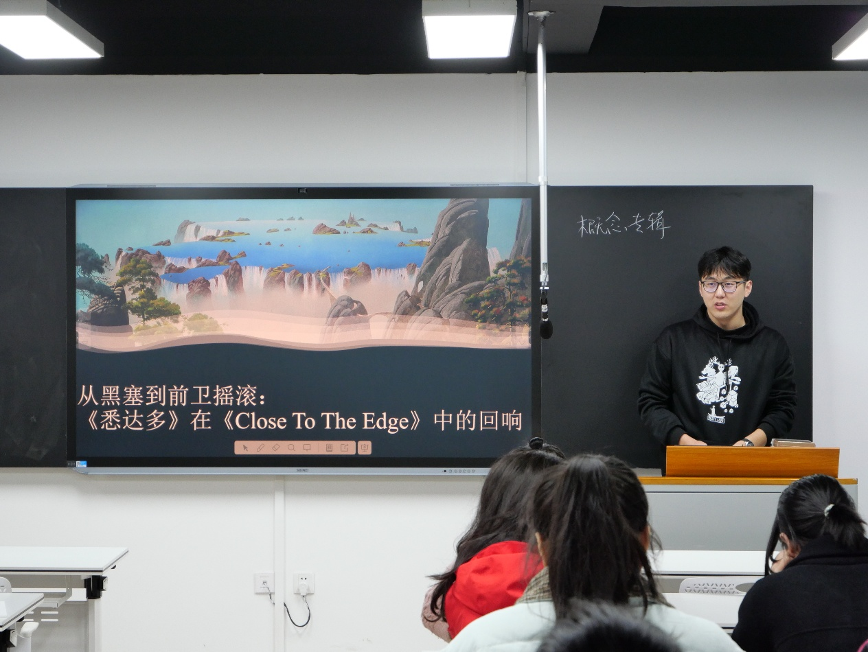 潘乐存首先介绍了前卫摇滚这一独特的摇滚乐类型以及Yes乐队的创作历程,深入剖析了前卫摇滚的主要特征,并巧妙借助“概念专辑”的理念将黑塞的作品和前卫摇滚联系起来。随后,他引领同学们欣赏了Yes乐队的长篇杰作《Close To The Edge》,并在欣赏完毕之后转而深入解读《悉达多》的文本内容,重点探讨了悉达多的四次转变及其背后的觉醒动因,以此为主线探索了该作品“寻找自我”主题的深层内涵。为了促进更直观的理解,潘乐存为大家呈现了《Close To The Edge》四个乐章的歌词,选取其中的关键意象与《悉达多》进行了对照式解读,通过解析《悉达多》来阐释《Close To The Edge》中宏大晦涩的歌词内涵。这种对比阅读的方式让同学们对《悉达多》的主题有了更加生动和深刻的理解,也为《Close To The Edge》的开放性解读增添了新的视角。