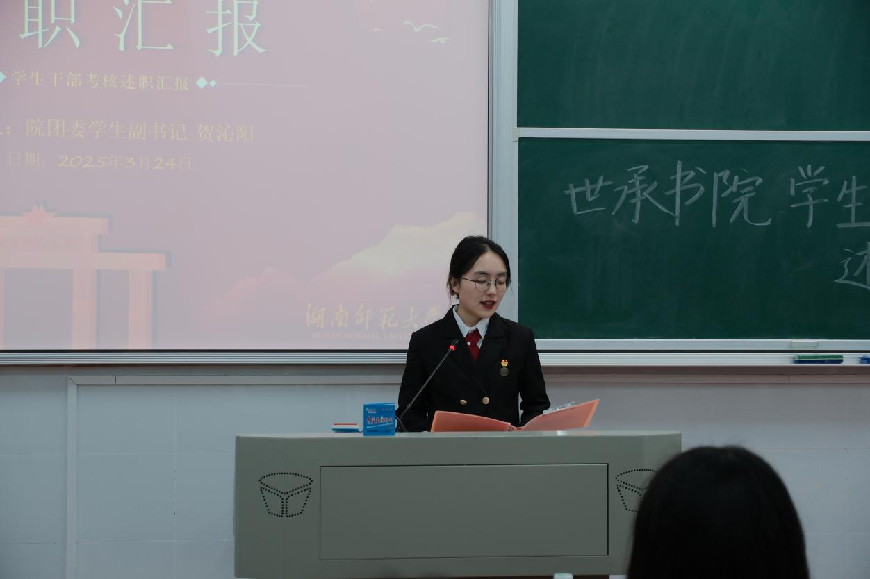 3月21日下午,yl23455永利官网举办了2024—2025学年度学生干部述职大会。yl23455永利官网团委书记刘铮、2022级辅导员彭诚意出席会议。校、院团学组织主要学生负责人轮流述职,各班团支部的学生评议代表进行民主评议与问卷打分。学生干部们结合自己的工作经历,详细汇报了过去一年的工作成绩与不足。尤其是在组织策划活动、加强学生干部队伍凝聚力、服务同学等方面,并提出了具体的工作成果和创新举措。学生代表对学生干部们的工作表现进行了认真评议,提出了宝贵的意见与建议。