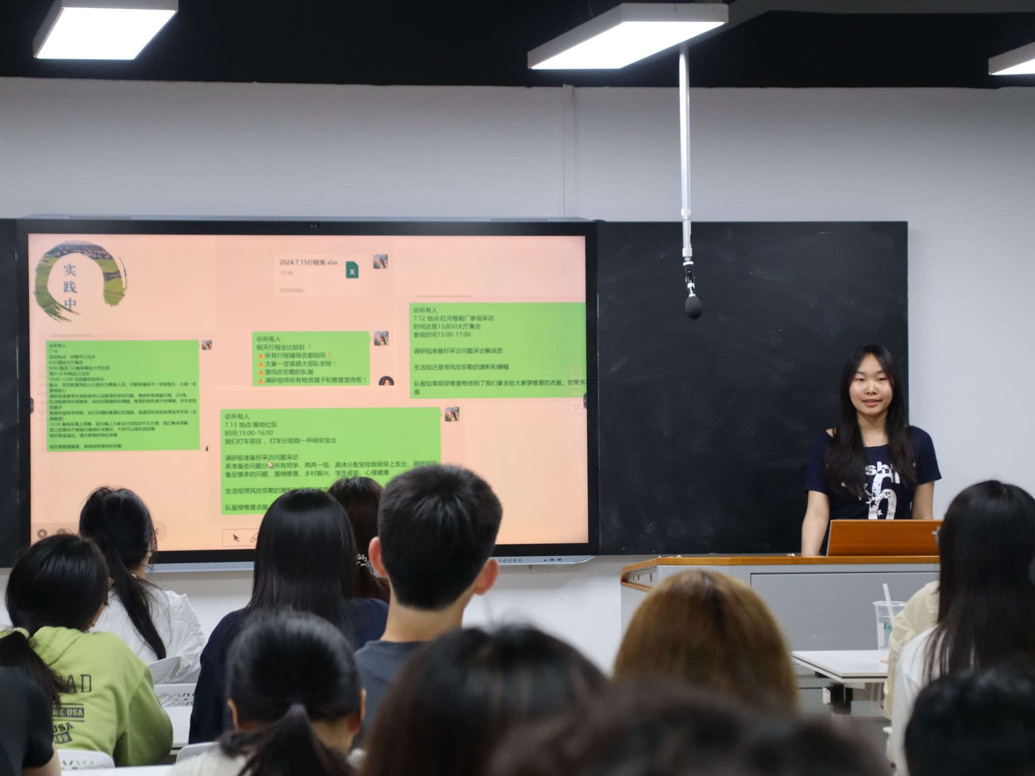 接下来,本次动员会邀请了两位2024年“三下乡”优秀团队的负责人孟宇彤和陈红秀作为主讲人,为大家具体介绍“三下乡”的活动流程。她们用自己的亲身经历为大家详细介绍了一个团队如何建立,团队中各部门如何正确分工运营,活动专项如何申报以及活动方案的调整与落实方式一一呈现给同学们,在精心制作的总结视频和热情洋溢的讲述中,同学们对她们的所见、所闻、所感有了更加深刻的体会。