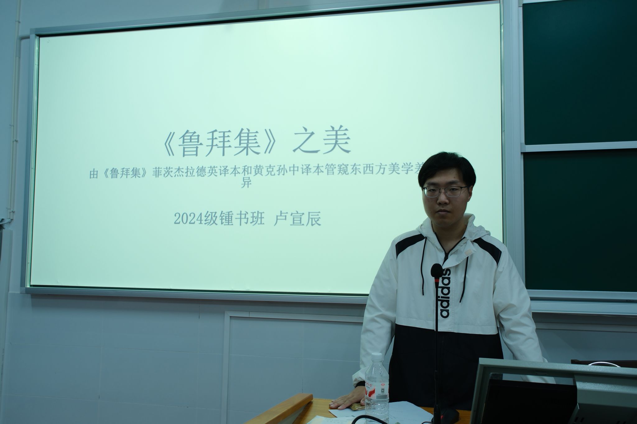 (通讯员 卢宣辰 祁靖雯 潘秋屹)5月26日晚,yl23455永利官网“文澜思潮”外国文学系列主题读书分享会第九期活动于文渊楼211教室顺利开展。此次活动由2024级锺书班卢宣辰主讲“《鲁拜集》之美——由《鲁拜集》菲茨杰拉德英译本和黄克孙中译本管窥东西方美学差异”。