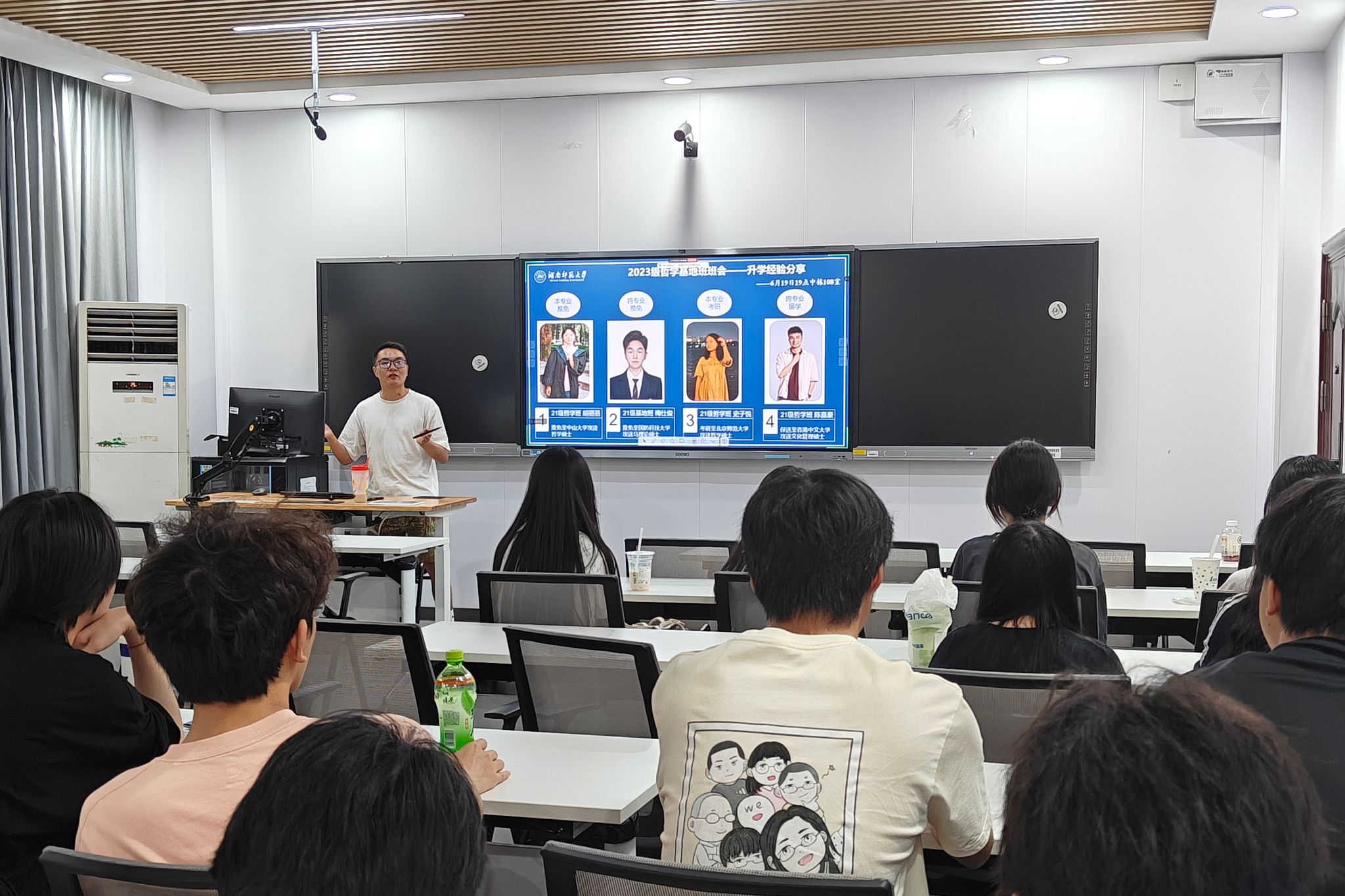 班导师胡景谱老师介绍了升学的主要途径,包括保研、考研、出国留学等方向,并结合往届毕业生的实际去向进行讲解。为增强指导效果,班会邀请多位在不同升学路径上取得优异成绩的学长学姐进行经验分享,内容涵盖目标确定、背景提升、材料准备、考试安排等关键环节,突出操作性和参考价值。