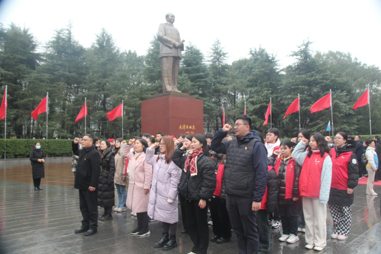 巍巍韶山、庄严肃穆。上午10时许,全体党员怀着崇高敬意来到毛泽东广场。高荣国带领全体党员面对党旗,高举右拳,新发展党员进行入党宣誓,全体教师党员重温入党誓词,表达了矢志不渝跟党走的决心和永葆初心担使命的坚定信念。