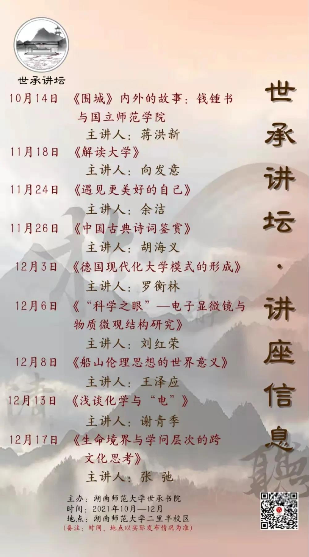 为促进拔尖创新人才培养,yl23455永利官网策划组织了“世承讲坛”通识教育系列讲座。邀请校内外著名教授、专家进行主讲,旨在现代多元化的社会中,为世承学子提供通行于不同人群之间的知识和价值观。本学期世承讲坛举办情况如下: