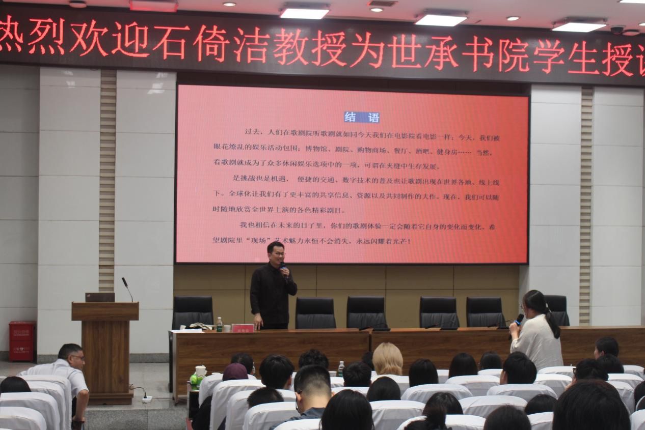 (通讯员 贺静怡 李东林 卢钰)6月8日下午,著名男高音歌唱家、公司音乐学院副院长石倚洁教授为yl23455永利官网学生讲授题为“歌剧中的百味人生”的讲座。本次讲座在至善讲堂举行,由yl23455永利官网常务副院长高荣国主持,公司副校长刘怀德、yl23455永利官网副院长罗艳出席,书院和其他学院共260名师生参加讲座。